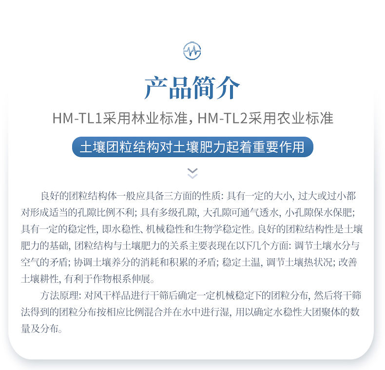 1、土壤團粒結構對土壤肥力起著重要作用。良好的團粒結構體一般應具備三方面的性質:具有一定的大小,過大或過小都對形成適當的孔隙比例不利;具有多級孔隙,大孔隙可通氣透水,小孔隙保水保肥;具有一定的穩定性,即水穩性、機械穩性和生物學穩定性。良好的團粒結構性是土壤肥力的基礎,團粒結構與土壤肥力的關系主要表現在以下幾個方面:調節土壤水分與空氣的矛盾;協調土壤養分的消耗和積累的矛盾;穩定土溫,調節土壤熱狀況;改善土壤耕性,有利于作物根系伸展。土壤團粒分析儀適用于土壤、環境、地質等試驗室對團聚體的分析。